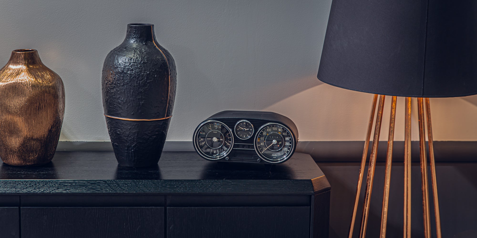 Car instruments repacked into retro-modern functional decorations. Equipped with a time clock, wireless charging, speakers and other playful features. Kept faithful to original aesthetic design but enhanced for modern use.
